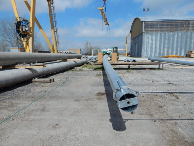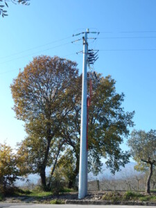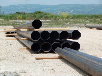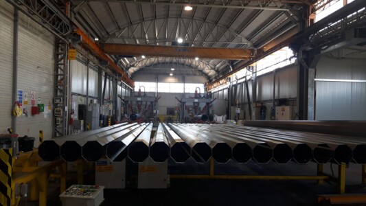 Per la produzione dei pali viene utilizzata lamiera di acciaio da laminazione a caldo (EN 10025) di qualità S235JR e S355JR, la cui lavorazione viene effettuata in perfetta osservanza del capitolato di fornitura ENEL DS 3010 del maggio 2007. Questi hanno una struttura da otto e sedici lati e sono progettati per il sostegno di linee elettriche aeree di MT e BT. Le lamiere di forma trapezoidale, dopo essere state piegate tramite presse di lunghezza superiore a 12 metri gestite da PLC, vengono saldate con un procedimento di saldatura ad arco sommerso, certificato dall’Istituto Italiano Saldature, effettuato tramite una linea di saldatura automatica gestita da sistemi software.